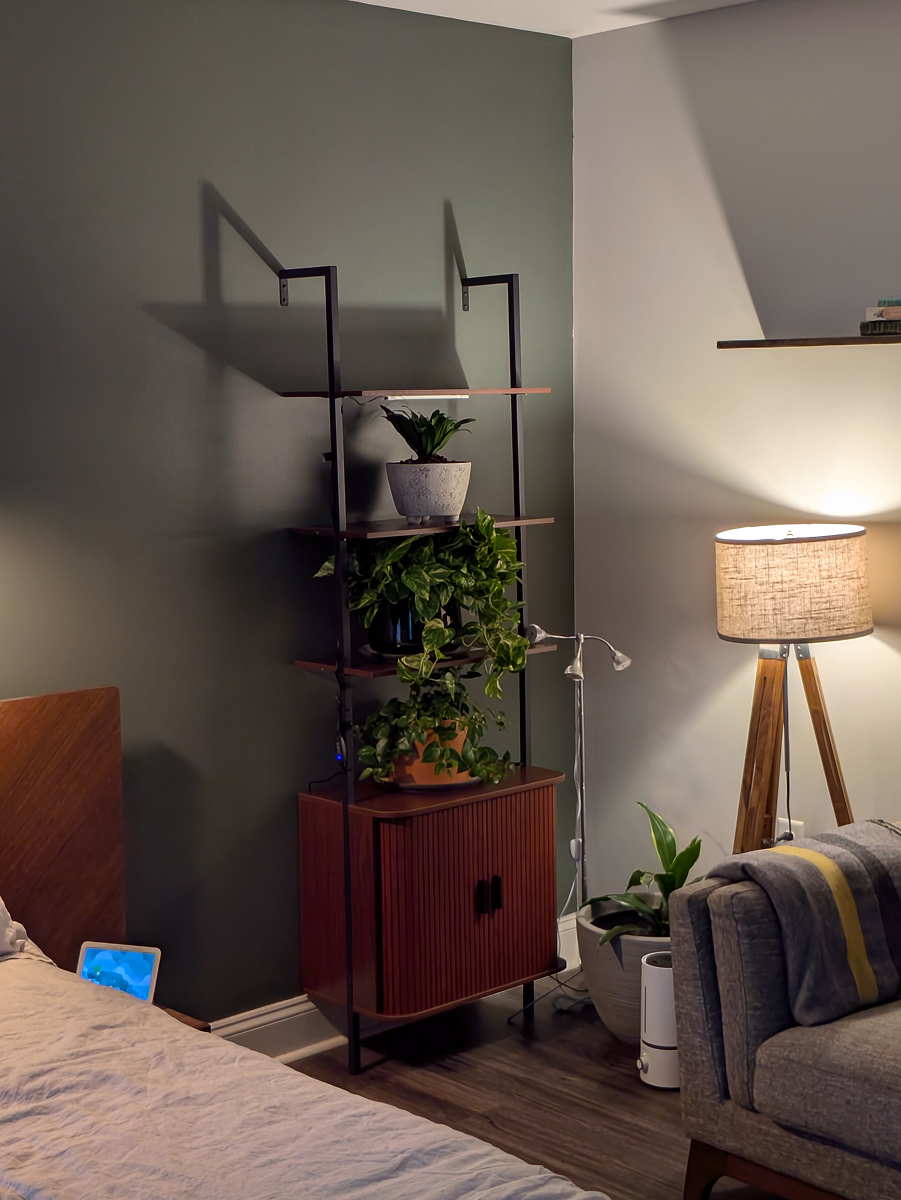 The second change was to my bedroom. Since my windows face north, I picked up a wall mounted shelf and added some grow lights so that plants could survive in the otherwise dark corner.