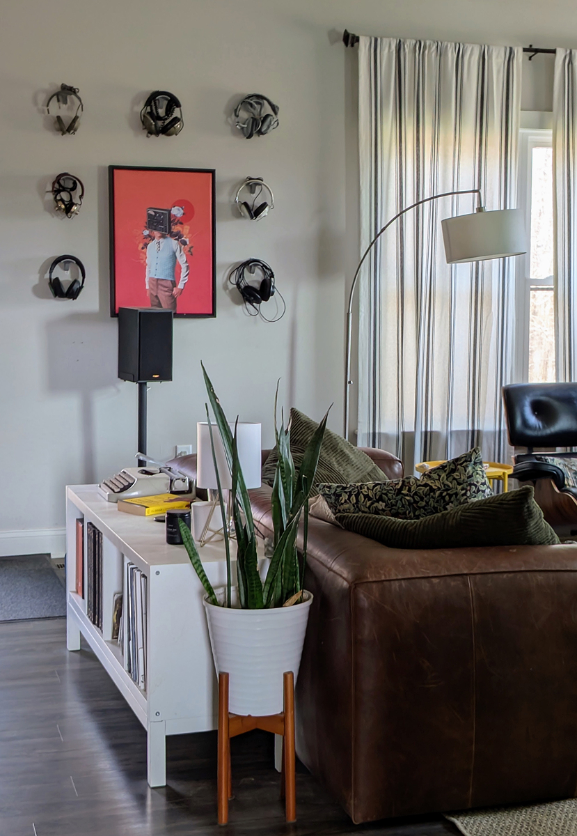 I've long had too many headphones, so I decided to lean into that, buy a few more, and mount them in the living room. It gives a little depth to the wall.